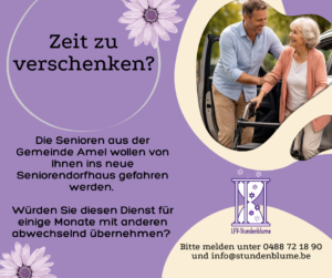 Zurzeit suchen wir Ehrenamtliche in ganz Ostbelgien, die mit ihrem Privatauto individuelle Fahrten mit Senioren übernehmen, beispielsweise zu Arzt- und Krankenhaus-Terminen oder zum Einkauf. Das kann eine regelmäßige Fahrt an bestimmten Tagen oder auf telefonische Anfragen unserer Koordinatorinnen sein.